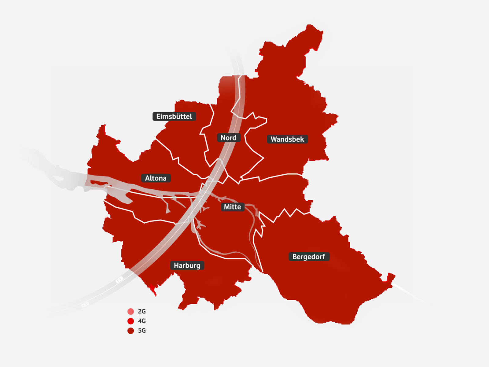 100 % aller Haushalte in Hamburg sind mit dem schnellen Breitband-Internet via LTE oder 5G versorgt. 99,2 % ihrer Zeit bewegen sich Vodafone-Kunden im schnellen LTE- oder 5G-Netz.