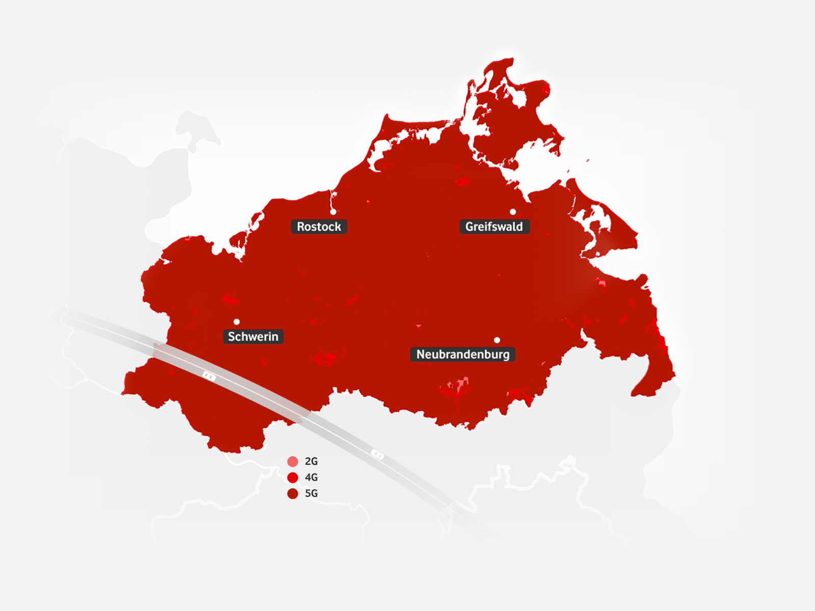 99,33 % aller Haushalte in Mecklenburg-Vorpommern sind mit dem schnellen Breitband-Internet via LTE oder 5G versorgt. 99,3 % ihrer Zeit bewegen sich Vodafone-Kunden im schnellen LTE- oder 5G-Netz.