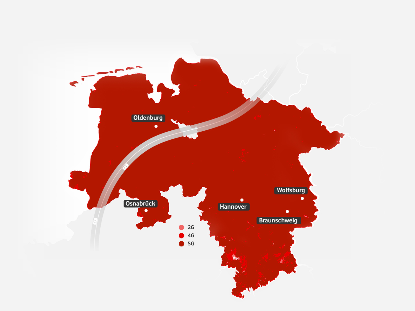99,4 % aller Haushalte in Niedersachsen sind mit dem schnellen Breitband-Internet via LTE oder 5G versorgt. 99,1 % ihrer Zeit bewegen sich Vodafone-Kunden im schnellen LTE- oder 5G-Netz.