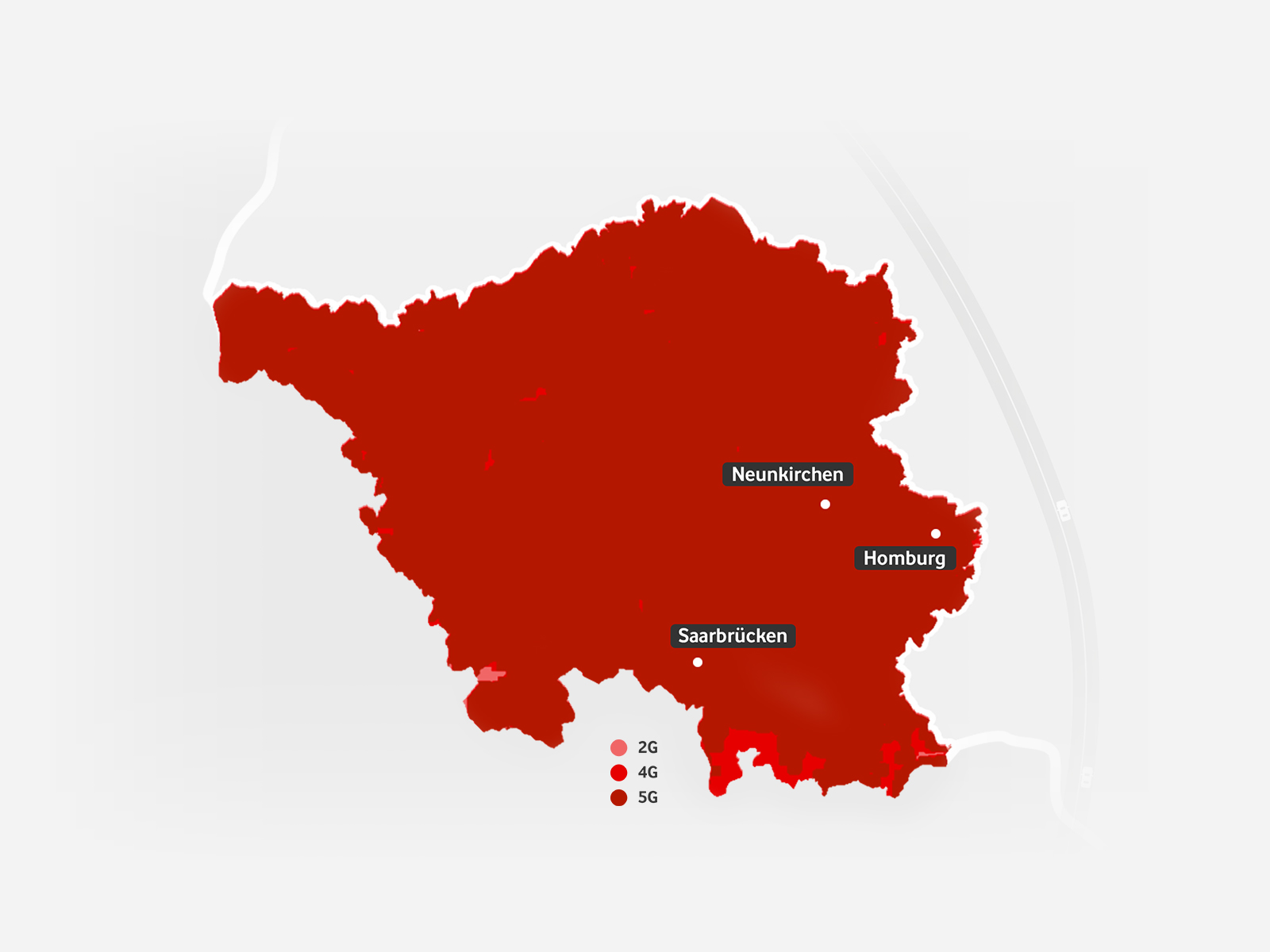 99,3 % aller Haushalte in Saarland sind mit dem schnellen Breitband-Internet via LTE oder 5G versorgt. 99,0 % ihrer Zeit bewegen sich Vodafone-Kunden im schnellen LTE- oder 5G-Netz.