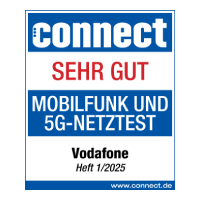 Im Mobilfunk-Netztest der Zeitschrift connect (Ausgabe 01/2025) erhält Vodafone die Gesamtnote „SEHR GUT“ (924 Punkte). 2 weitere Anbieter im Test, Telekom (970 Punkte, „überragend“, Testsieger) und Telefónica (909 Punkte, „sehr gut“).