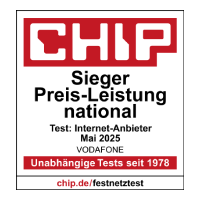Sieger in der Kategorie „Preis-Leistung national“ im CHIP-Test „Internet-Anbieter“ (Ausgabe 07/2025). 4 Anbieter im Vergleich. Berechnung und Auswertung auf Basis von eigenen Messungen von CHIP sowie auf Basis von im Zeitraum April 2024 bis April 2025 durch Internet-Nutzer vorgenommene Speedtests der Up- und Downloads über speedtest.chip.de unter Auswahl von Tarifen der Vodafone-Gesellschaften unter Angabe der Download-Geschwindigkeit.